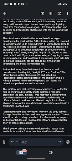 Really bummed about my experience today. I called for almost 2 hours about off leash dogs at Ponderosa Park. They sent Trident security and Trident joked about the calls with the lady who had the off leash dog. Her dog then knocked over a toddler. I was transferred to the Lead Joel. He never answered, never called me back and only sent Trident again. Trident circled the parking lot and left for the 3rd time. There is still an off leash lab...