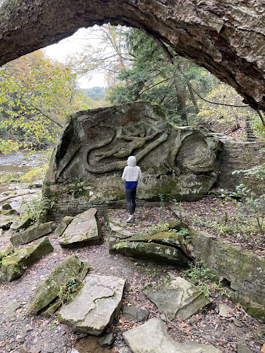 This is a great place to walk to and take photos, and you're able to walk a smooth path above, or hike a path along the river. The story behind the rock is also pretty amazing as well, and is not mentioned on the plaque in the forest. Henry Church carved this rock by lantern-light as an outcry against the abuse of Native Americans by white people back in the late 1800s. Truly a beautiful sight to behold once you approach it, with a lot of inclusions to find in...