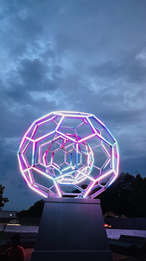 From the artist's caption, "Leo Villareal is a sculptor who uses light as his medium. Through the technology of LED bulbs and computer software that Villareal designs, the artist creates ever-changing displays of moving light and color. Named in honor of the theorist and engineer Buckminster Fuller, Buckyball features two nested geometric spheres that take the shape of a Carbon 60 molecule. The structure is covered in LED tubes capable of producing 16 million distinct colors."