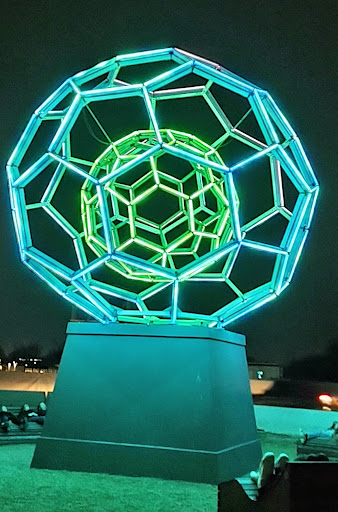 A bit more impressive than the neighboring "Heavy Handed" because Buckyball is lighted! Yes, the aluminum tubing includes LED lights.