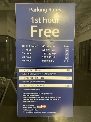 Read moreUpdate on pricing!! First hour: free. Two hours: 2 dollars. Three hours: 4 dollars. Four hours: 6 dollars. Anything more than four hours: 16 dolars. Early bird rate (in before 9 and out before 5): 9 dollars. Always has spots. You should leave out the stairs and you have to come back in through the elevators because the door to the stairs is a one way door. The levels need to be relabeled!!!! If you were on 2b or 3a, get off at floor 3. If you were on 3b or 4a, get off at floor 4. Just...