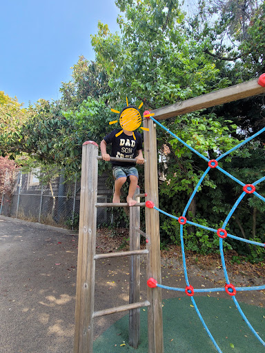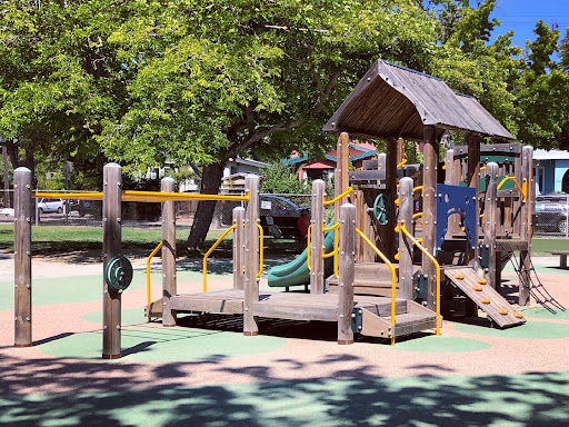 A decent size toddler park (but elementary kids enjoy it too) on a not so busy street in Berkeley. Most tot parks I’ve seen are small but this one is very open with lots of different play opportunities. There is a gate all the way around with shade, grass benches, picnic tables (adult and kid sized), a colorful mural, and bathrooms. For play there is the structure, a rope web, swings (bucket and standard but not next to each other in one set), a spinning seat, a play house, and a sand box with water feature (great for getting your feet wet on a hot day but not a splash pad). The structure is mostly wooden with steps, climbing wall, climbing rope, two slides (a sidewinder and a double), monkey bars and various activities including a scavenger hunt. Street...