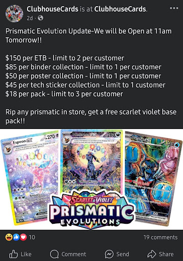 Read moreCame in today to try and purchase the new Prismatic Evolutions ETB, and was shocked to see on the sign the $150 price tag for one (Thats 3x MSRP for those new to collecting). I asked an associate to confirm the price to inquire why its priced how it is, but presumably the owner overheard me and asked “If I can read” and “If I read the sign I would know the price” all while not even looking at me.