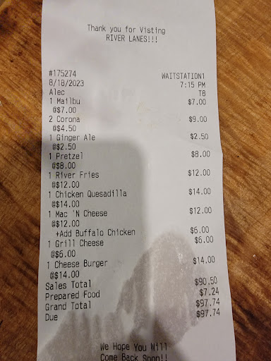 Read moreRiver Lanes - self described as an "Family Fun Bowling - Entertainment Center built from the ground up. Guaranteed Fun For the Whole Family....offers a relaxed atmosphere...." However, the owners of this business miss one incredible detail. Beginning right from the front door, to the arcade, to the bar, to the bowling lanes - the entire place is covered with signs telling you what you can NOT do. "NO food or drink" "NO Water bottles or Coffee Cups" "NO sneakers". Think about this from a hospitality standpoint and everywhere you turn your being told what you cannot do. Nothing says "Welcome" like the first sign you see on the front door telling you what not to do.