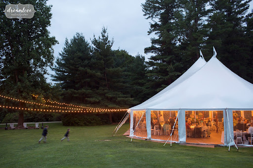 This venue has enough space for weddings of up to 350 guests, but still feels really cozy for medium sized weddings of 100-150 guests. Ceremonies can be held outside on the great lawn with either a pine forest backdrop or the picturesque tea house as the backdrop. There is an expansive tent for the reception, complete with string lights and a solid floor.
