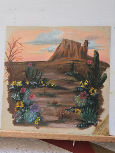 A few weeks ago I started my third and fourth project with Beth, the art instructor at Lost in the Woods art gallery. I drove from the Palm Springs area specifically to have her as my instructor. She's incredible and so inspiring. I took oil classes from her last year when I lived up there for 5 months, and also I did a beautiful acrylic with a pallet knife for the first time. She's exceptionally patient and thorough with her guidance and most of all, fun. This time I did an acrylic abstract, which I was scared to death to do...lol. The next day I did an oil pastel desertscape, which I fell in love with. I have such a long way to go, but I have learned so much from her, and she gives me the confidence to go out on my own and to keep practicing and trying. I think she's an incredible artist and I'm honored to be able to take classes from her and pick her brain... I've had other art instructors, and I must say, Beth is my favorite. I have learned to see detail a lot better and I'm never disappointed at the outcome of each project that I have done. Looking forward to my...