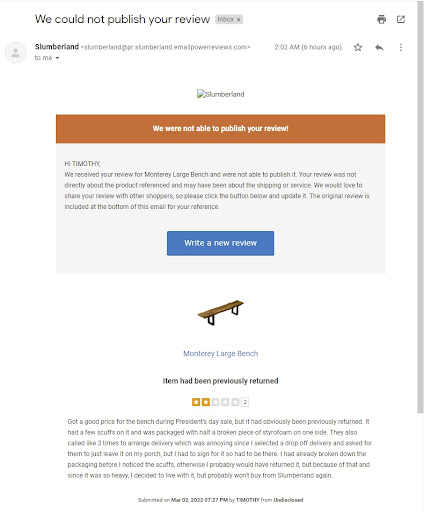 I bought furniture for which was delivered on 10/8/22. I was given a delivery window period of 2 p to 4 p. My furniture did not arrive until 6 pm and took until about 8 pm to be set up. I was not notified until I had to reach out to the drivers that they were running late. I understand that things come up and I was not the only delivery for this day, however I was waiting all day for this furniture as I moved into a new apartment and I had other plans that evening as well, so I was hoping it would be delivered on time. I received a customer service text message rating my experience at Slumberland and gave this person an honest answer. I was told that this information would be communicated to the delivery team and it is October 16 and I have not heard back from anyone from the delivery department. I reached out to my sales associate Frank and Chris at Slumberland Bloomington. I was told by Frank that in order to consider any way to rectify this he had to send a message through corporate and it may take up to a week to hear back. I just think I spent a lot of money in the store that I would hear back by now and to come up with a resolution on how to compensate for this inconvenience. I do have to admit my purchasing experience was good but actually getting the items was not good at all. Also, there was one piece of furniture, a chair that came with a desk I bought that was defective and the delivery team was unable to assemble it. I was supposed to hear back from customer service for a replacement. I had to reach out to my sale associate Frank on Friday of this week to inquire about this. They could send a replacement, but again I would have to deal with the delivery department where I would have to wait for a time to be assigned during the week when I work, which is not coinvent for me. Due to frustration, I said forget it. I am just disappointed with Slumberland in not reaching out to me for my bad experience and not making things right with respect to...