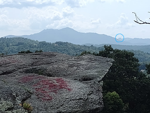as you gaze off into the sunset vista sorry folks, thats not tablerock mountain to the right of grandfather. . . . . thats SUGARTOP (see blue circle) a 10-story mountaintop monstrosity that has turned Sugar Mt (5000') & the Grandfather Mountain (5943') panorama into a western nc eyesore since 1983 (as you get closer...