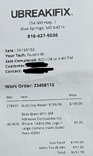 Overall horrible experience. I brought them my iPhone 14 to fix a very cracked back. During the repair they broke a piece that deals with my WiFi. They were polite and apologetic and supposedly rushed ordered the piece. I believe it was Daniel who did that repair. At this point I was pretty patient because I do understand that things happen. When the piece came in I took my phone back in to do the WiFi repair. Mind you this is a repair that takes 4 plus hours just like the issue I initially brought my phone in for. Once it was time for me to pick up my phone they let me know that while putting the back on that that something happened to the laminate on my back plate and that they would have to order a new one because they didnât have it. The person who gave me back my phone that day (I didnât get his name) told me that it wouldnât take 4 plus hours because it isnât cracked and should be pretty straight forward. I wasnât offered a rush on the part like the last time. It was at least 2 weeks before I was contacted about the part being in. Instead of just texting me that the part was in like they did before they texted me and left a voicemail that I needed to call about my repair. This was a little alarming to me. When I called them back turns out they were just letting me know about my part being in. This time I spoke to Dustin. I asked about the time of the repair he let me know that it was going to take at least 4 hours. This was the opposite of what the guy in store told me. At this point my patience with this process has worn out. I work Monday-Friday so the only day that I have to bring my phone is on Saturday. It was very discouraging to hear that I would have to do this for a THIRD time. I asked if there was any money off that I could get for the initial repair for the waste of my time and the inconvenience. Dustin let me know that they are compensating me by not charging me for repair. I told him you guys keep breaking it so you shouldnât charge me! He then asked someone about a refund. When he came back on the phone he said that he would have to ask a manager about any type of a refund and that it was very hard to refund once someone paid. Dustin was very polite but after all this I donât trust that they wonât break something else while they are trying to âfixâ my phone again. No manager got in touch with me either. At the end of the day I spent almost $300 to have my phone broken in different ways at the expense of my time. Bring your phone here at...