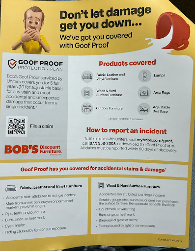 Do NOT waste your money on purchasing the "good proof" warranty. We bought 2 couches and spent $800 on the warranty after being told we could badically spill a gallon of paint on it and just get a replacement. In fact, the salesperson suggested we do something like that and just replace it before the warranty was up. Very unfortunately, my mom had a medical emergency thus ruining the couch. I cleaned the couch while my mom was in the hospital only to find the warranty is void if you clean before a technician comes. After making a claim, Bob's contacted us to set an appointment to look at the couch about 6 weeks after the incident and making the claim. In essence, I was to leave this couch with what was on it marinating in my home for around 6 weeks to see if a technician would deem it covered by the warranty.