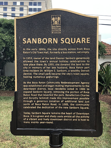 Sanborn Square is a beautiful green space located sandwiched between Federal Highway and Mizner Park in Boca Raton. There is a stage, portico, a sidewalk lined with Royal palms, and beautiful fountains. During the holiday season the city of Boca uses the space to put up a manager, Christmas Tree and other holiday themed lighted decorations. The square had a moment in the spotlight when in 2016 a local teacher erected a 10 foot Satanic pentagram in response to the cities religious display.