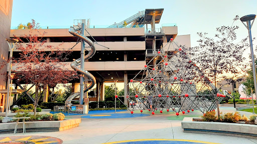 Towards the rear of their building by their parking garage, they have a tall, netted climbing pyramid, giant metal slide, and basketball court, as well as a small area releasing mist.