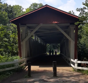 Covered bridge is one of the most well-kept & sturdy that I’ve seen in a long time. Crosses a beautiful stream/river with rocks that create a soft water sound. There’s a sandstone viewing area to the side of the path, with historical informational placards.