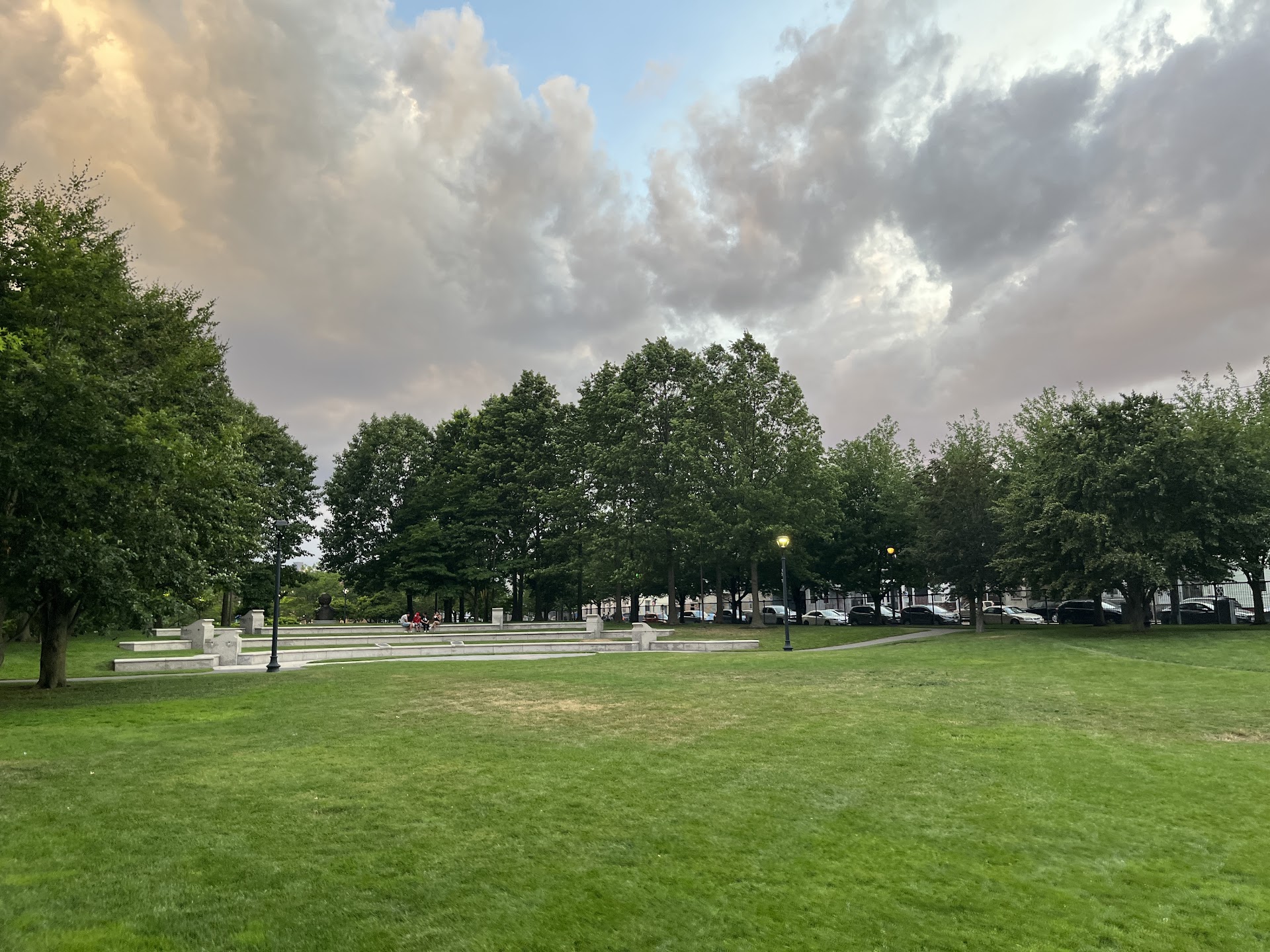 I was saying at a hotel nearby and wanted to get out for a walk and found this green space with long, beautiful paved walkways. There is so much play equipment and so many people happily using it. Green lawns are mixed in under the highway overpass, and the trees make it very pleasant. There are lots of amazing specimens of trees often clustered in groups of 3 to 10. I found Magnolia, dawn Redwood, Siberian crabapple, Chinese Elm, red maple, pin oak, red oak, Oakleaf hydrangea, pitch pine, baby Sycamore, and mature Sycamore, swamp, white oak, Chestnut Oak, tulip trees, horse chestnut, yellow, and gray birch. I walked all the way to the library and circled the community gardens which are always lovely. There’s also a bocce court. At the southern end the path leads to another recreational area full of soccer, and baseball fields. The play area at the southern end has a spray park and giant mature oaks that provide lots of shade. There are also gazebos and...