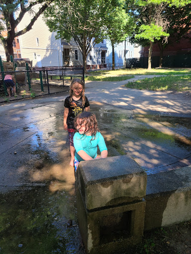 There is a lot going on in this small park. A toddler area, "big kids" area for probably up to 9 or 10 year olds. A basketball court with good backboard and rims and nice tree coverage and a small cement splashpad which I'm sure are welcome...