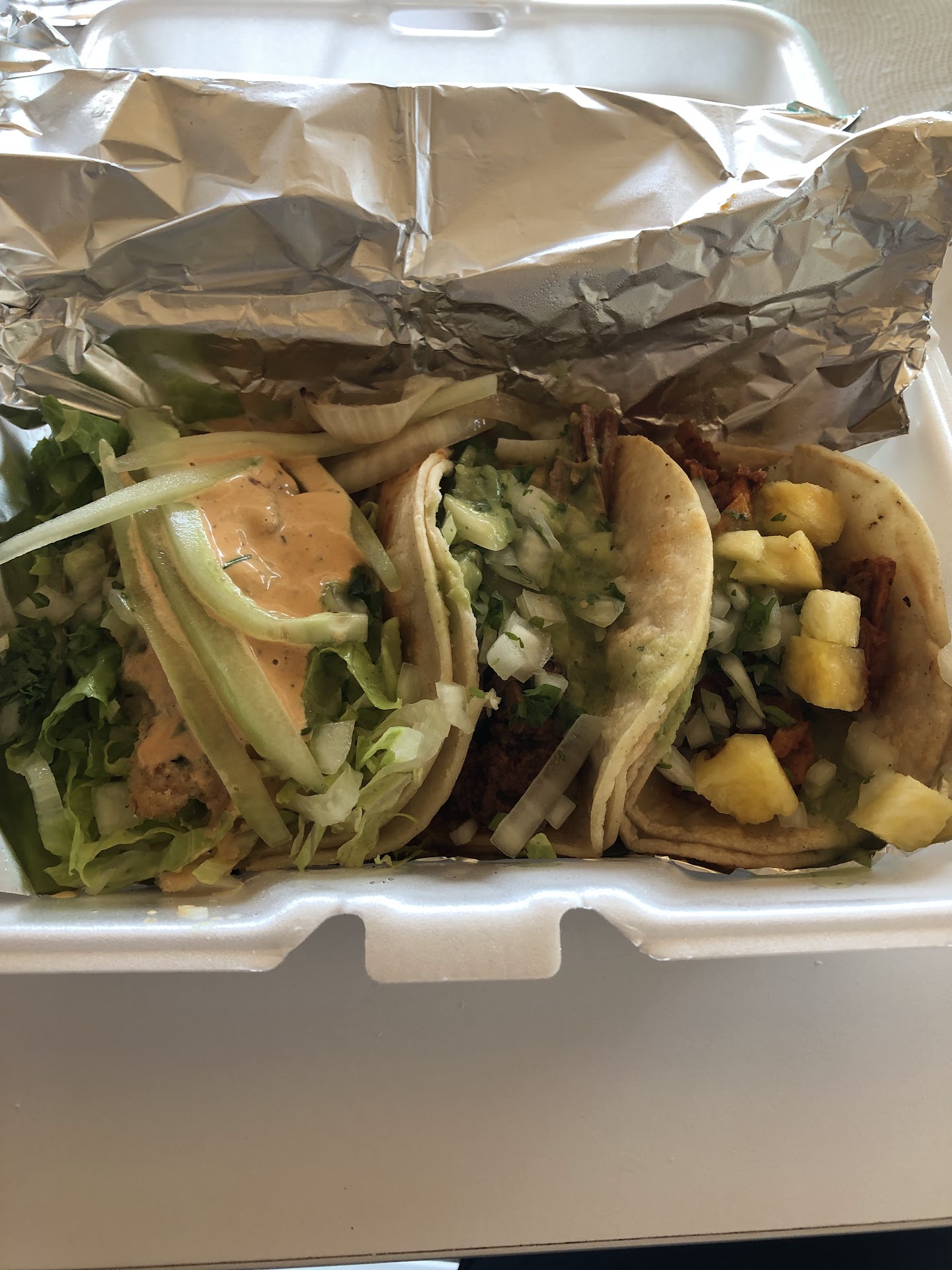 Tacos: 3/5 The fish taco was ok. I had taken it to go, so by the time I ate it, it was a bit soggy. There was a smoky sauce of some sort which kind of threw me off, as I was expecting more brighter/citrus flavors for a fish taco. Pastor taco was good. The chicken was a bit dry but complimented well with pineapple. The last taco I had was the Campechano. This was the best of the three. The chorizo and carnitas were juicy and...