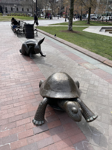 An interesting pair of statue figures you can see in Boston are that of the Tortoise and Hare located near the pool on Copley Square. These are another local creation of Nancy Schön (1993) who also gave Boston the Making Way for the Ducks statues in the Boston Public Garden.