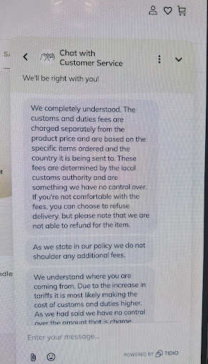 Edit in response to the owner: Nowhere in your pre sales did it say I would have to shell out more than half the cost of the pants I ordered. If I read that, I never would have purchased. I get that you arenāt responsible and you really donāt care about my situation. Obviously. This is just a caution to others who are thinking about ordering...