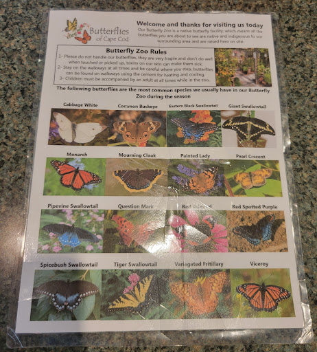 I had high expectations before I went and I planted this idea in my head that I would be walking through beautuful gardens filled with flowers and shrubs and the butterflies would be flying around and landing on me, this was not the case. Butterflies of Cape Cod is a very small quaint place. You walk into the gift shop and purchase your $6 ticket. Than you get a list of butterflies that they have for viewing. You than walk outside the gift shop back door and enter the backyard. Once you get outside in the backyard you follow a butterfly path and you'll see an enclosed butterfly sanctuary like structure. You go through the structures door and enter it. Inside there you'll see numerous educational postings with butterfly information on them, hanging flower pots above your head and a glass box containing pupas. The butterflies were out of reach as there's no walking through their area to go over to them. Some were hanging on to the flowers in the hanging pots above my head, some would fly over my head and in my face from the closed off section where they rest upon the screen, on top of flowers or where their fruit was placed. I spent approximately about 20 minutes taking pictures and talking to one of their employees. The employees are amazing, professional and helpful. They're very knowledgeable about butterflies and I learned things about them I never knew. Even though it's an extremely small butterfly place it's cute and quaint. I find this place great for adults and especially for children as they would learn some wonderful education about butterflies and how to respect and love all of YHWH’S...