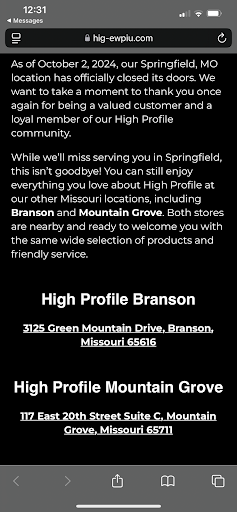 I have never had a bad experience with this particular dispensary. No matter how bad my day is the employees at HIGH PROFILE DISPENSARY in Branson Missouri always seems to find the right thing to help me with. The caliber of professionalism and friendliness is unmatched and this is actually the only dispensary I'll frequently visit. The only bad thing I can say about this place is because they make it so difficult to choose because their choices of items is out of this world. Either way no matter what I choose from HIGH PROFILE I am certain I've never been able to make a bad choice thanks to Lucy P. and her selfless outgoing professional yet uplifting personality. With that being said I look for her familiar face every time I visit the dispensary for her knowledge on products and eagerness to be so helpful. HIIGH PROFILE DISPENSARY of Branson Missouri is a treat for every legal adult looking to make the most of their day by consuming life's most potent aspects. Thanks...