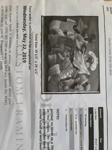 Read moreI do not visit any Michaels regularly, but my understating is that they are a decent place to get your arts and crafts supplies from; for the most part, it should be an uneventful trip. I brought a very large piece to be framed and my experience was awful. They ended up creasing the print and blaming us for it being that way, the back of it kept peeling up and the random employee who stepped in to "help out" was condescending and told us that it "should" not happen again because they "double check it 3 times" just as he is asking someone passing by for double tape so he can tape down the piece that is coming up right as we were speaking. Unfortunately, it was a gift and my choice was either return it and get my money back or take it as it was. When leaving and I asked for protective packaging they stated they may not have cardboard big enough... hmmm maybe if you sell it carry packaging big enough to protect it from your store to my house? Lesson learned, buy supplies there? Maybe... but go elsewhere for framing help. It made it home safe, lucky for us the crease is barely noticeable because of the glare on the glareless glass we...