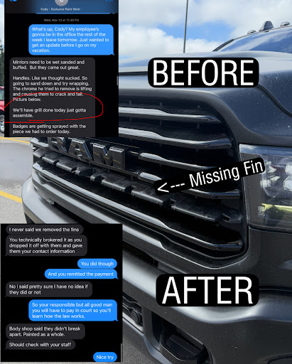 Owner of the shop said he could paint match parts on my 22 Ram 2500 Limited. Later I found out he brokers paint work to a local body shop whom removed 6 fins to paint them individually on my $2,000 Ram Grill. Months later the Fins came loose and one of them blew off while driving the truck. (The fins are only available in chrome & as a whole grill assembly.) I brought it to his attention & he refused to pay for it. He kept denying that since the body shop he brokered the parts to painted it means he’s not involved, & then said they didn’t remove them. He in fact said that they were “assembling the grill” prior to pickup. Then backtracked & said that they never removed them to remove himself from the matter after he was backed into a corner. Customer beware. The owner doesn’t stand behind his work & I am filing a lawsuit in Oakland county...