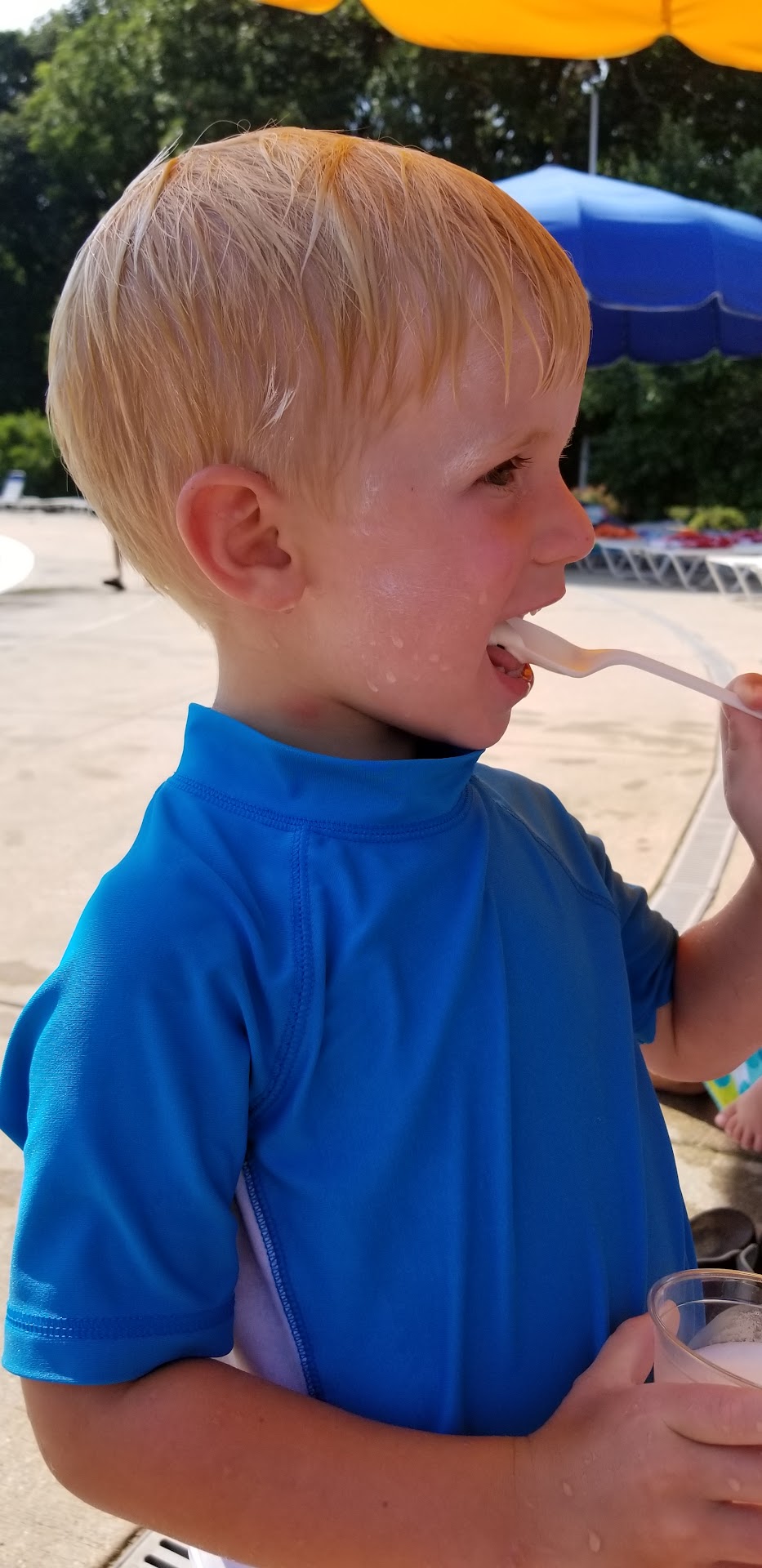 We were told we could not bring food/eat in the pool area, even at the picnic tables by the snack bar. We gladly complied. However, some lifeguards did not enforce this rule for other patrons and they were allowed to eat/bring food near the pool area.