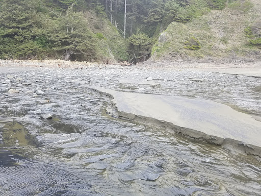 An ever changing beach with waterfalls. As you pull in you see a sign warning that you need a 4x4. There a small parking lot to the right you can park small low clearance cars in then cross the drive to coastal trail that will take you to the lower parking lot. There a small path to beach from here or continue from coastal trail to switchback and cross the bridge continuing on coastal trail to the beach. Even those who use the lower parking lot can use this trail (take the side walk and pass the bathrooms into the woods you'll see the trail markers and bridge). It takes you around so you don't have to cross whaleshead creek on the beach which in winter is too cold to cross in bare feet and too deep to cross without boots. However, sometimes the trail is flooded after long periods of rain. Not impossible to pass but you need boots. In summer you can't beat going either way. The trail offers views and old growth forests. The beach on the Parking lot side of the creek at low tide has fun rocks to check out and small tidal pools, even a few small caves. Cross whaleshead creek and trek down the beach to see several waterfalls. In summer there is a few still going strong. In the winter keep an eye on the tide though. Farther down the beach it seems to come in quicker and there's a mini point impossible to get back past once the...