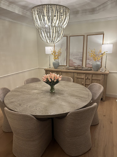Accent chairs and round dining tables are often in abundance.