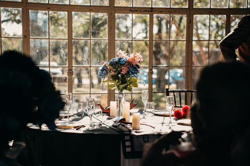 There are two adjoining rooms and a kitchenette. The main room has a beautiful fireplace and can hold six 6 foot round tables for an event. The adjoining room - although not as decorative, is slightly bigger. We used it as a dance floor and for the cake cutting ceremony.