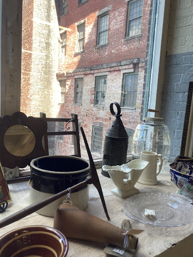 The mill itself reflects Brunswick’s long history along the river. Once a site for trading posts and later for textile manufacturing, the building’s preservation and reuse connects the town’s industrial past with its present-day economy. Inside, exposed brick, beams, and high windows frame rows of antiques ranging from furniture to folk art.