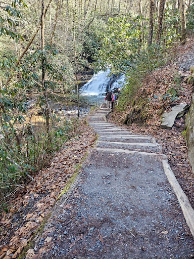 Very nice trail. There are the normal dirt landscape timber "steps" down to view the falls. As with any kind of decent and incline it could be hard on the knees. We didn't do the loop,we back tracked to Juney Whank. That is definitely a steep incline. We almost always take our dog, we didn't have her this time. And that's 1of the reasons I wanted to do these falls. There is a no dogs on trail "rule". Clearly posted, but I suppose if a person doesn't research they wouldn't know I guess. It's clearly posted at trail head, but I suppose people get there and have there dog and find out then. At any rate there were around 6 dogs we saw, leashed and all well behaved, but that's not the point. As a doglover I'm just saying there are rules for a reason. Very nice area with restrooms and picnic areas. We stayed in Bryson City, it was busy...