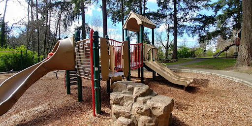 Two play structures (one big, one little) and picnic tables with grills dominate the north end of this hilltop wooded 5 acre park. From S. 146th Street you might not realize the park extends two city blocks to the south, dropping nearly 100’ in elevation down to S 148th Street, offering some nice views along the way.
