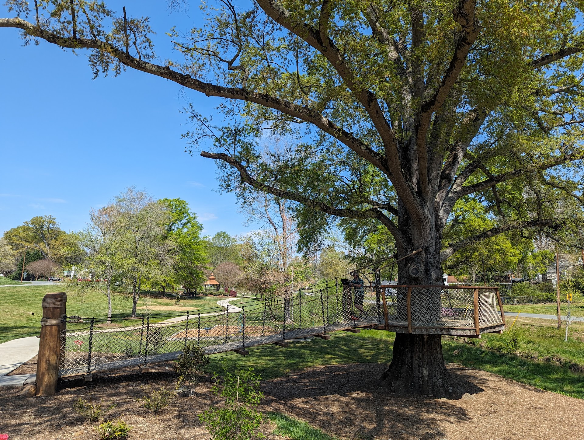Thoughtful landscape architecture with handicapable accessibility. Wide walking/running paths and bridges. Picnic tables. Bathrooms. Playgrounds. Bubbling stream. Native plant species and local small wildlife. The "tree house" is my favorite. A VFW monument honoring our men and women from all services.