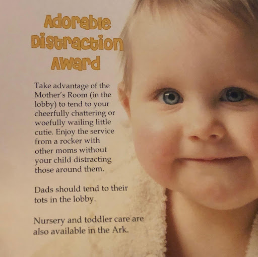 Take advantage of the mother’s room (in the lobby) to tend to your cheerfully chattering woefully wailing little cutie. Enjoy the services from a rocker with other mothers without your child distracting those around them.