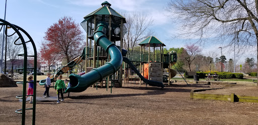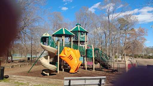 I love this park so much. It's got a ton of fields for the kids' leagues, a play area with a goldfish slide and swings, and two tennis courts. Also, two sets of bathrooms, one on the walking trail and the other air-conditioned and with drink machines.