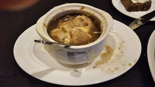 The onion soup was bland. We could tell because it didn't have that rich brown color that onion soup has when it has been simmering all day. The lobster bisque had very little lobster meat in it and, again, was bland.