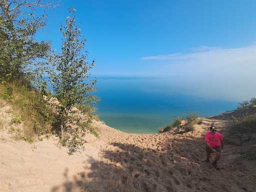 The log slide is a nice stop with some interesting history. You can still see the packed sand from where they pushed the logs over the side to the water. If you read the signage you'll see when the say logs they mean massive logs. The parking lot has a drinking fountain and foot wash station and vault toilets theres additional parking for trailers. The path is paved till you get to the 50 yards from the edge then the path becomes deep sand. WARNING!!! read the sign at the top it appears to be a nice hill but when you get about 1/2 way down you run into sand cliffs there's a lot of climbing up this cliffs on the way back up it's not easy even for the well conditioned if you go down take plenty of drinking water and plan for about 20 minutes down and 2 hours back up... Phone service is not the greatest right here but with Verizon you can get thru to 911 about 1/2 back upš... Stay safe and...
