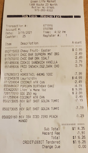 Ā Ā Ā Read moreI discovered Green Life Market while driving to Willowbrook Mall in Wayne, NJ and when I saw the sign I immediately turned into the parking lot where there was a huge banner "Grand Opening." I was completely surprised by the selection of products in the store! First of all, it is very clean and items are neatly placed on the shelves. I bought healthy cereals, snacks, ground fair trade coffee, ice cream and gelato on sale for 99 cents a pint, and other goodies. When I got to the register, I purchased a membership. The prices are much lower than other similar stores and the membership lowers prices even more. The second time I shopped at the store, I saw the "clearance" section that I missed my first time there and lost my mind! I filled the cart to full capacity with cereals, wholesome snacks, yogurt, etc. The clearance prices were incredibly low and I was very happy to save so much money. Cascadian Farms granola for $1.99 a box! I bought 6 of them. Purely Elizabeth 5 grain and seed cereal for 99 cents! Green Life Market is the best market. It really has everything - from fresh organic produce, vegetarian, vegan, cleaning products, paper products, vitamins, personal care, essential oils, amazing deli, Peepers reading glasses, courteous and helpful staff, and so much more. The third time I shopped there I took my time looking at everything and then enjoyed a delicious mozzarella and grilled eggplant sandwich from the deli and a hot cup of coffee. When I returned home I took a picture of everything I bought and posted it on my Facebook page. My friends were happy to learn about the store and said they would definitely check it out. Green Life Market is superb! I met the owner and we chatted a little bit. He was very welcoming and I told him how much I love the store. He brought my groceries to the...