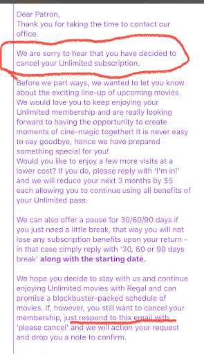 Do NOT get Regal Unlimited. The Regal Cinemas dont have enough new movies to make it worthwhile, its a lot of old movies they are reintroducing or movies you’ve never heard of that should have been straight to streaming. But that’s not the worst part, they make it impossible to cancel. You’ll notice that there is nowhere to cancel Regal unlimited through the app. Even if you go into a regal cinemas, they won’t let you cancel there either. You have to send a email request for them to cancel. And in my case they still didn’t cancel they sent me another email saying it we’re goinf to cancel but there was even more I had to do - BUT they sneaked it in at the VERY BOTTOM of the email so I didn’t even notice. So I kept thinking it was canceled, but they were still charging me. When I brought it up, and showed them that I had never used the app in that entire time because I thought it was canceled, they said oh sorry and still charged me and refused...