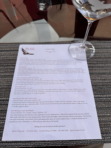 Read moreI recently visited Big Sur Vineyards and had a wonderful experience. In addition to being knowledgeable, Lenora is a friendly, down to earth, and made the experience extra fun with her warmth and enthusiasm for our wine tasting experience. If you're looking for excellent wine with friendly service, I recommend you visit Big...