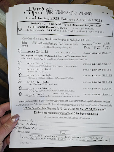 Read moreCoffaro wines are affordable and they're better priced if part of the wine club. Small tasting room which has been redone but not much to look at. Fabulous petite sirah and carignane - my favs. Gave 4 stars because their server is a young female who doesn't offer any information whatsover about the wines. She pours and stands there. The wines do sell for themselves but it helps to the overall wine tasting experience having someone who knows about Coffaro wines and can share knowledge about what goes into the wine making process and various other wine...