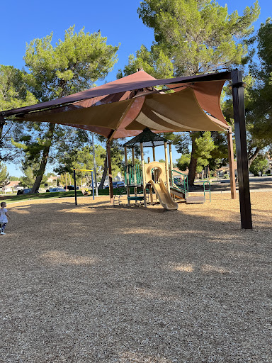 Reviewing mainly the playground, I thought it was great. The floor of the playground is relatively thin wood chips (not splinters). The two playsets are shaded by large fabric sails. I consider the swings far enough apart, and the one large swing with a shoulder and lap harness kind of like on a roller coaster was pretty neat too, though I wish it was shaded too. Each playset has slides and stairs, one playset taller than the other. They also both have other ways of getting to the upper level. Near the playground is what looked like a skate park, and also two full size basketball courts (4 hoops). I didn't go in, but I think there are restrooms within a couple hundred feet of the playground. Across a sidewalk from the playground are about 7 or 8 cement bench style tables for dining. This park is a good choice for shaded fun...
