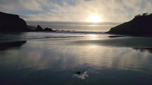 Beautiful Beach! This beach is a gem. It is more protected from the southern and northern originating winds than other beaches. It is located in a large cove with a creek that runs down through it. This beach can be popular during the summer months. Dogs on leash allowed. Tip: Wear secure shoes on the trail down to the ocean it is down hill and has a small drop off from the trail to the beach. Also be very careful when near the ocean! Even the smallest waves can catch a person off guard. Be wary about the quick moving and sometime...