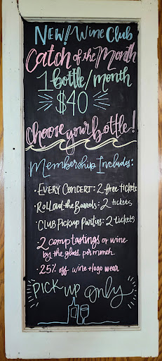 We brought a to-go order with us for lunch and opted for a glass of Sparkling for me and their Cuvee Blanc for him....and we were so happy to be there, we purchased a bottle to stay longer! As time went on, we signed up for their "Catch of the Month" club with wonderful perks - including outdoor concerts starting this April. (their sign below...concerts on Saturdays also have a taco bar with fresh-caught fish, carne asada, and more!)