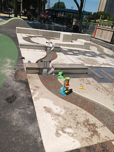 Fully enclosed playground that allows kids to push their limits. Creative water play with dam features and adjacent splash pad. Bouncy turf material. Sand pit with fossil features. Shade spots at all times of day. Port-a-potty just outside of playground. Water fountain. No permit required street parking (decent...