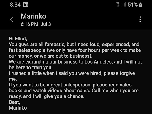 I have attached the extremely condescending and patronizing text message of him firing me over text before I could even work a...