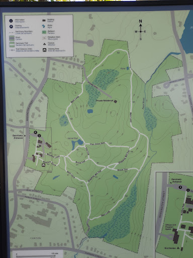 Review of trail only: Lovely sanctuary for a mild hike! It is smaller than appears on the map. I did a figure-8 walk using the main loop and smaller connecting trails in the middle, and it was exactly 2 miles. Perfect for some light to invigorating exercise. VERY well-marked trails! Trail signs in words, not just colors. But also colored trail markers if you do get turned around. I enjoyed the sounds of blue jays and woodpeckers and others- more than I've seen or heard at other similar parks and trails. Unfortunately, there is also a lot of air traffic noise to remind you where you are! The restroom is in a building called The Nest near the trailhead. There are picnic tables at the trailhead and a couple of benches near the brook. The ponds were nothing special in September. Not suitable for strollers. No...