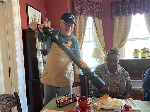 Erica returned early in the morning and served us all ooey gooey French toast with fresh berries and bacon. Yum! Again, we had a pleasant conversation at the table of seven with four new guests from the day before and three of us who already knew one another.