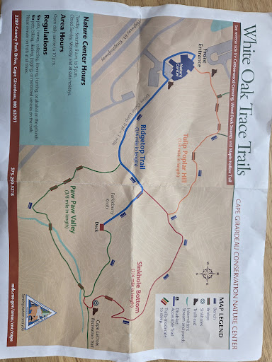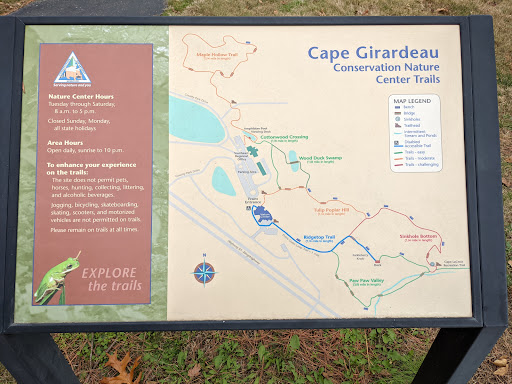 Nature Center is fantastic for families or if youre just looking to get out of the house and out of the crazy weather. Facility is 5 star clean from exhibits to bathrooms. Receptionists are friendly and very helpful. Plenty of nature / conservation resources including surrounding state parks and trails in the SEMO region. I literally was able to take a small bag of content home for further research and outdoor planning (biking and kayaking).